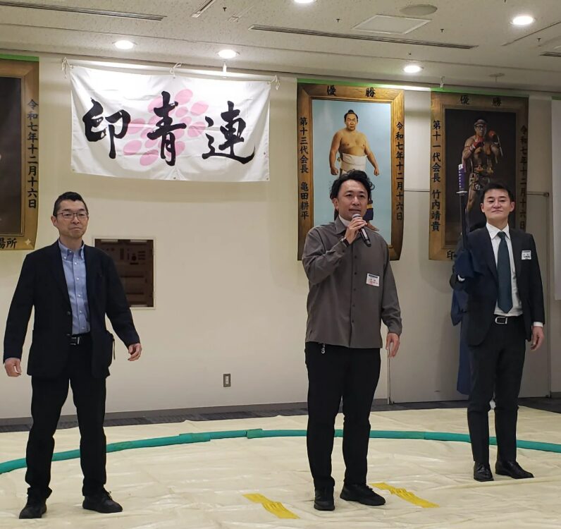 12/16は印刷産業青年連絡協議会の忘年会。協賛で顕彰旗を作って貰きました。力士の股割り、ストレッチしかないそうですw。