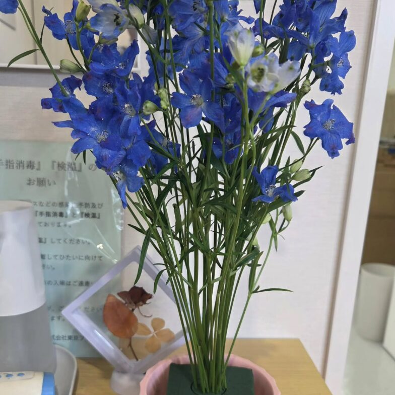会社の入口に何かを飾るようにしています。今は青がきれいなデルフィニウムです。